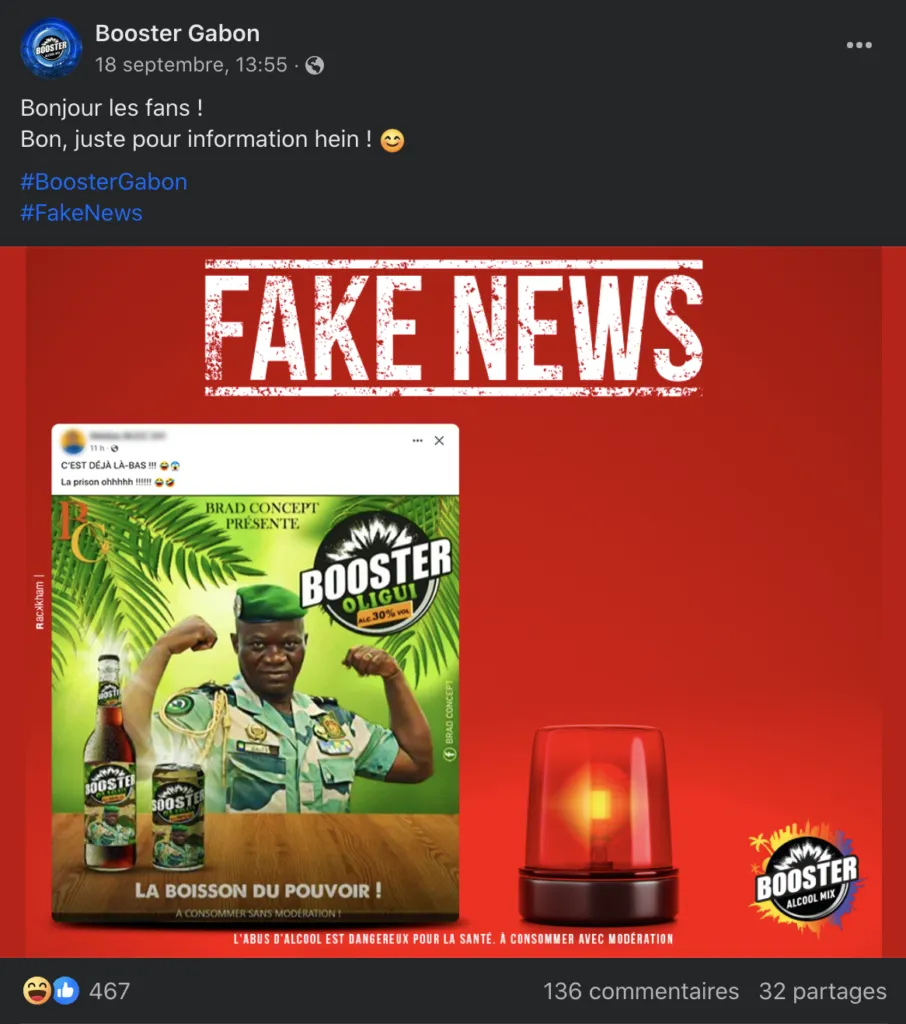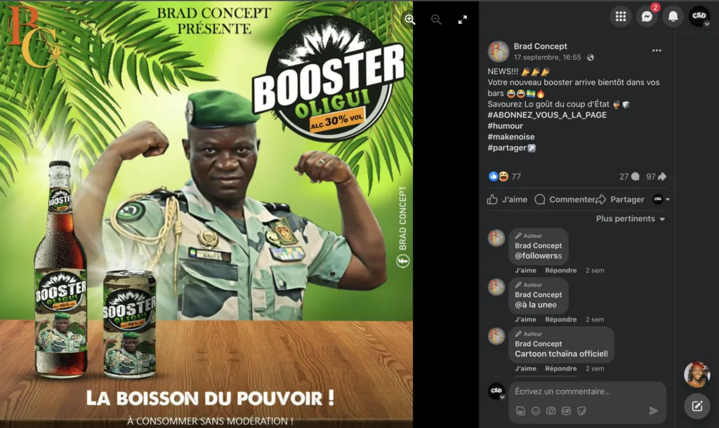 Tout part de cette image qui fait le tour des réseaux sociaux depuis le 17 septembre dernier et où on peut lire sur un logo : Booster Oligui. Essissima, journaliste camerounais au quotidien Mutations, fait partie de ceux qui l’ont relayé sur les statuts WhatsApp. Selon le contenu, il s’agirait d’un nouveau produit brassicole qui est attribué à la gamme de boissons alcoolisées Booster. Sur le visuel, le nouveau président du Gabon, le général Brice Oligui, ses deux bras levés et les poings serrés ; ajouté à ses photos sur l’étiquette d’une bouteille et celle d’une canette. En dessous, le slogan « La boisson du pouvoir ». Sur Facebook, 97 comptes partagent cette information divulguée par Brad Concept depuis le Gabon. L’image est signée et précédée des hashtag #Humour, #Makenoise. En parcourant la page de Brad Concept à 105 followers, l’on peut conclure qu’elle fait de la parodie sa ligne éditoriale.