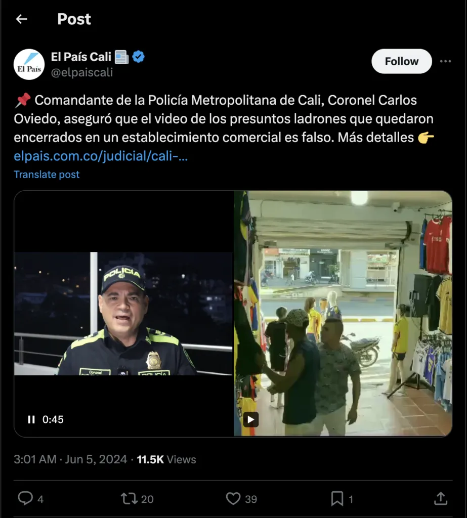 Dans un extrait vidéo de 67 secondes, le commandant de la police métropolitaine de Cali, le colonel Carlos Oviedo, assure que la vidéo des voleurs présumés qui ont été enfermés dans un établissement commercial est fausse. « Après des semaines d’investigations, entendu que nous n’avons reçu aucune plainte, nous avons pu nous rendre compte que cette vidéo est une mise en scène et je mets en alerte les créateurs de contenus afin qu’ils se montrent plus responsables car ce type de contenus qui ont été faits pour divertir, peuvent avoir de graves dégâts institutionnels (Ndlr)», d’après traduction française de sa déclaration.